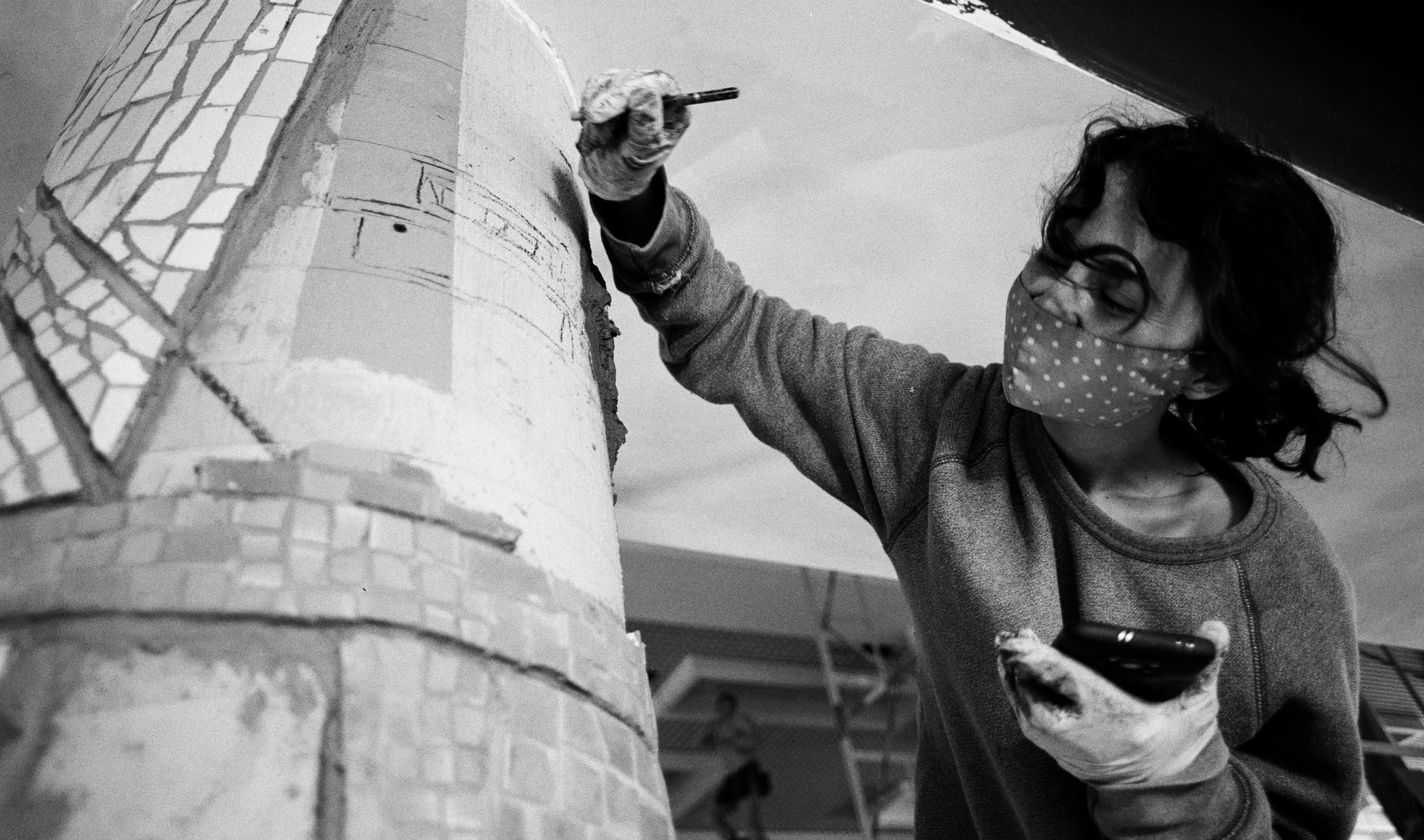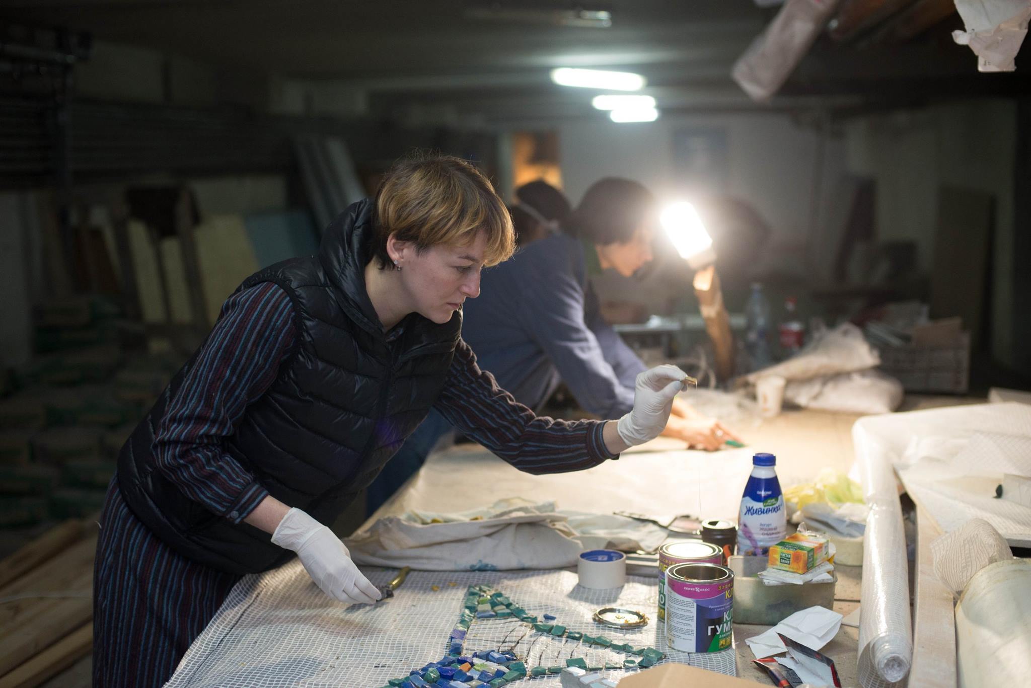 Один раз він просто приїхав і широким жестом, пензликом на патику намалював нам пластику та композицію колон, на яких не було мозаїки і фото яких не збереглося. А далі довіряв нам у тому, що ми вирішимо, — так там зʼявилися кілька новостворених сюжетів на колонах. Усі роботи тривали з лютого по червень — це досить швидко, однак нам вдалося залучити близько 200 волонтер_ок. Це величезна організаторська робота, якою займався фонд. Роботи були розділені на реставраційні та мозаїчні, я керувала саме мозаїчною роботою.
